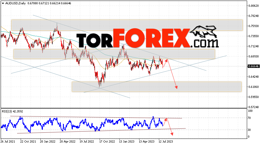 Дополнительным сигналом в пользу падения пары на Форекс выступит отскок от верхней границы нисходящего канала. Вторым сигналом станет отскок от нисходящей линии тренда на индикаторе относительной силы, стоит отметить, что на индикаторе RSI формируется разворотной модель «Голова и плечи». Отменой варианта падения валютной пары AUD/USD на текущей торговой неделе 31 июля — 4 августа 2023 станет сильный рост и пробой уровня 0.7135. Это укажет на пробой сопротивления и продолжение подъёма Австралийского Доллара на Форекс с потенциальной целью на уровне 0.7475. Подтверждением развития снижения выступит пробой области поддержки и закрытие цен ниже уровня 0.6405, что укажет на пробой нижней границы бычьего канала коррекции.
