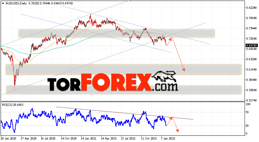 Дополнительным сигналом в пользу падения пары на Форекс выступит отскок от нижней границы бычьего канала. Вторым сигналом станет отскок от нисходящей линии тренда на индикаторе относительной силы. Отменой варианта падения валютной пары AUD/USD на текущей торговой неделе 31 января — 4 февраля 2022 станет сильный рост и пробой уровня 0.7565. Это укажет на пробой сопротивления и продолжение подъёма Австралийского Доллара на Форекс с потенциальной целью на уровне 0.8245. Подтверждением развития снижения выступит пробой области поддержки и закрытие цен ниже уровня 0.6805.