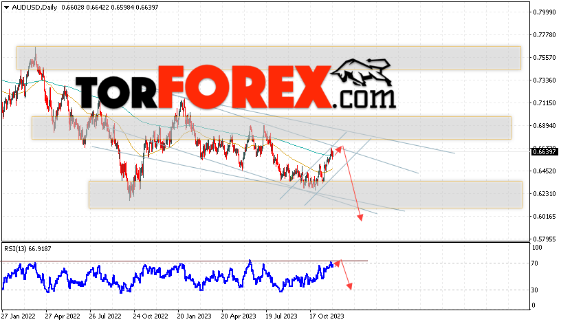 Дополнительным сигналом в пользу падения пары на Форекс выступит отскок от верхней границы медвежьего канала. Вторым сигналом станет отскок от нисходящей линии тренда на индикаторе относительной силы. Отменой варианта падения валютной пары AUD/USD на текущей торговой неделе 4 — 8 декабря 2023 станет сильный рост и пробой уровня 0.6875. Это укажет на пробой сопротивления и продолжение подъёма Австралийского Доллара на Форекс с потенциальной целью на уровне 0.7285. Подтверждением развития снижения выступит пробой области поддержки и закрытие цен ниже уровня 0.6435, что укажет на пробой нижней границы бычьего канала коррекции.