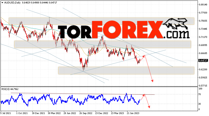 Дополнительным сигналом в пользу падения пары на Форекс выступит отскок от нижней границы бычьего канала, который был пробит продавцами. Вторым сигналом станет отскок от нисходящей линии тренда на индикаторе относительной силы. Отменой варианта падения валютной пары AUD/USD на текущей торговой неделе 4 — 8 сентября 2023 станет сильный рост и пробой уровня 0.6765. Это укажет на пробой сопротивления и продолжение подъёма Австралийского Доллара на Форекс с потенциальной целью на уровне 0.7145. Подтверждением развития снижения выступит пробой области поддержки и закрытие цен ниже уровня 0.6405.