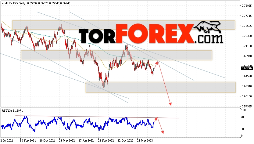 Дополнительным сигналом в пользу падения пары на Форекс выступит отскок от верхней границы нисходящего канала. Вторым сигналом станет отскок от нисходящей линии тренда на индикаторе относительной силы. Отменой варианта падения валютной пары AUD/USD на текущей торговой неделе 5 — 9 июня 2023 станет сильный рост и пробой уровня 0.6945. Это укажет на пробой сопротивления и продолжение подъёма Австралийского Доллара на Форекс с потенциальной целью на уровне 0.7285. Подтверждением развития снижения выступит пробой области поддержки и закрытие цен ниже уровня 0.6435.