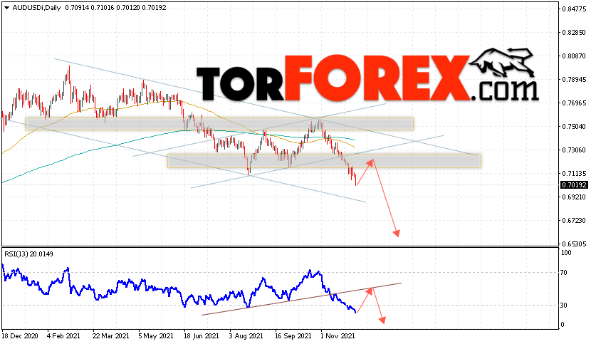 Таким образом, Форекс прогноз AUD/USD на 6 — 10 декабря 2021 предполагает попытку развития бычьей коррекции и теста уровня 0.7155. Далее, продолжение снижения валютной пары ниже уровня 0.6575. В пользу падения пары на текущий торговой неделе выступит тест линии тренда на индикаторе относительной силы. Отменой варианта снижения станет сильный рост и пробой области 0.7675. Это укажет на пробой области сопротивления и продолжение роста пары с целью выше 0.8285.