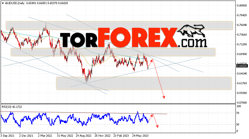 Дополнительным сигналом в пользу падения пары на Форекс выступит отскок от верхней границы нисходящего канала. Вторым сигналом станет отскок от нисходящей линии тренда на индикаторе относительной силы. Отменой варианта падения валютной пары AUD/USD на текущей торговой неделе 7 — 11 августа 2023 станет сильный рост и пробой уровня 0.7075. Это укажет на пробой сопротивления и продолжение подъёма Австралийского Доллара на Форекс с потенциальной целью на уровне 0.7485. Подтверждением развития снижения выступит пробой области поддержки и закрытие цен ниже уровня 0.6405, что укажет на пробой нижней границы бычьего канала коррекции.