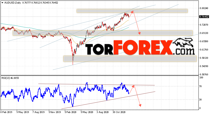 Дополнительным сигналом в пользу падения пары на Форекс выступит отскок от верхней границы восходящего канала. Вторым сигналом станет отскок от линии сопротивления на индикаторе относительной силы. Отменой варианта падения валютной пары AUD/USD на текущей торговой неделе неделю 1 — 5 февраля 2021 станет сильный рост и пробой уровня 0.8035. Это укажет на пробой сопротивления и продолжение подъёма Австралийского Доллара на Форекс с потенциальной целью на уровне 0.8375. Подтверждением развития снижения выступит пробой области поддержки и закрытие цен ниже уровня 0.7285.