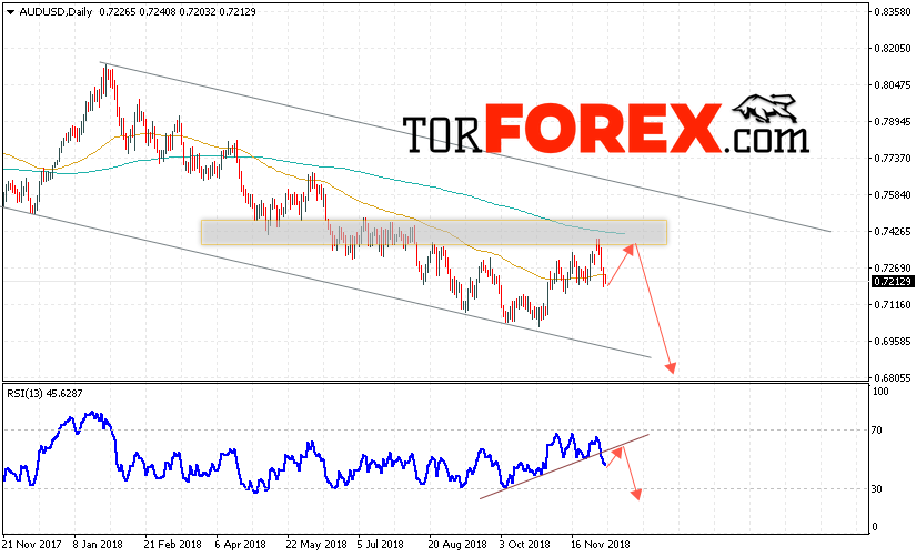 Таким образом, Форекс прогноз AUD/USD на неделю 10 — 14 декабря 2018 предполагает попытку теста уровня 0.7325. Далее продолжение падения ниже уровня 0.6805. В пользу снижения пары выступит тест линии тренда на индикаторе относительной силы. Отменой варианта падения станет сильный рост и пробой области 0.7580. Это укажет на пробой области сопротивления и продолжение роста пары.
