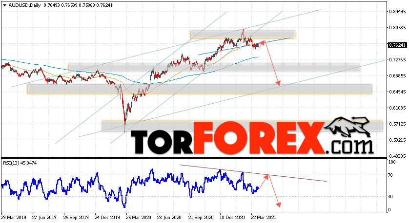 Дополнительным сигналом в пользу падения пары на Форекс выступит отскок от верхней границы разворотной модели ”Голова и плечи”. Вторым сигналом станет отскок от линии сопротивления на индикаторе относительной силы. Отменой варианта падения валютной пары AUD/USD на текущей торговой неделе 12 — 16 апреля 2021 станет сильный рост и пробой уровня 0.8175. Это укажет на пробой сопротивления и продолжение подъёма Австралийского Доллара на Форекс с потенциальной целью на уровне 0.8675. Подтверждением развития снижения выступит пробой области поддержки и закрытие цен ниже уровня 0.7505, что укажет на завершение формирования разворотной модели ”Голова и плечи”.