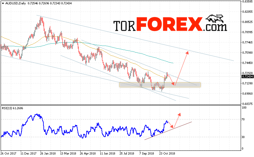 Таким образом, Форекс прогноз AUD/USD на неделю 12 — 16 ноября 2018 предполагает попытку теста уровня 0.7125. Далее продолжение роста выше уровня 0.7590. В пользу роста пары выступит тест линии тренда на индикаторе относительной силы. Отменой варианта роста станет падение и пробой области 0.6950. Это укажет на пробой области поддержки и продолжение падения пары.