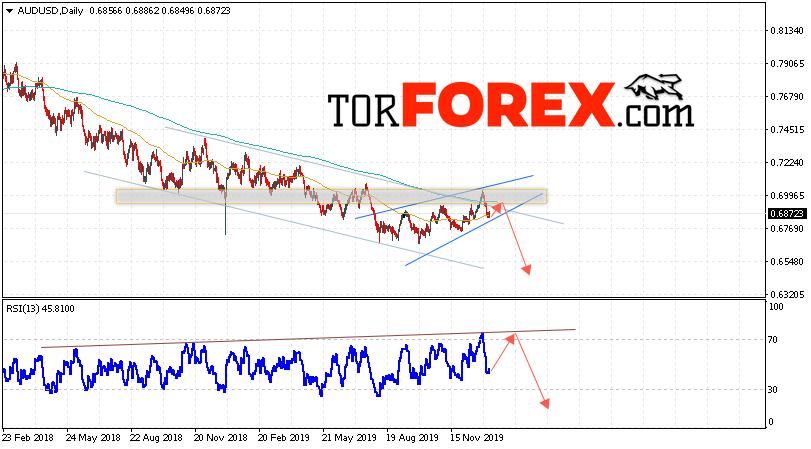 В пользу падения пары на Форекс выступит тест линии сопротивления на индикаторе относительной силы. Вторым сигналом станет отскок отскок от верхней границы модели «Клин». Отменой варианта снижения AUD/USD на текущей торговой неделе 13 — 17 января 2020 станет сильный рост и пробой уровня 0.7135. Это укажет на пробой верхней границы канала и продолжение роста Австралийского Доллара на Форекс. Подтверждением развития нисходящей тенденции выступит пробой области поддержки и закрытие ниже уровня 0.6735. Это укажет на ускорение падения валютной пары и начало отработки модели «Клин».