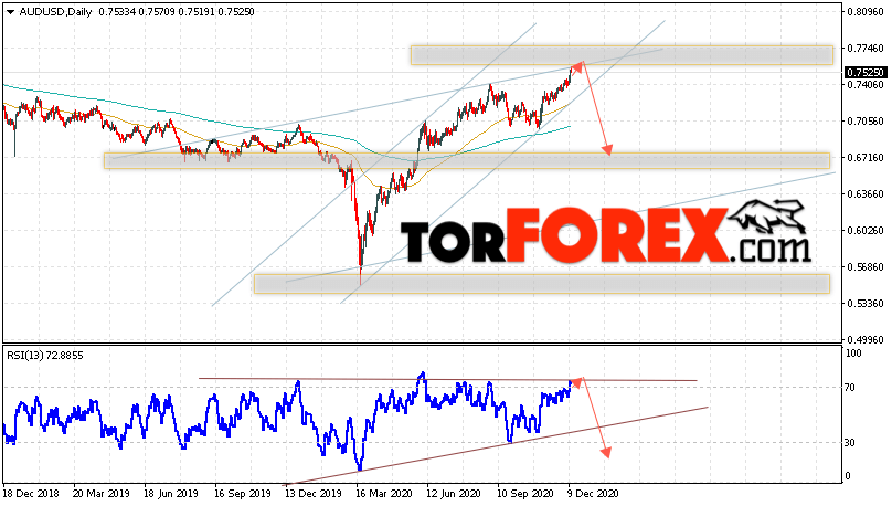 Таким образом, Форекс прогноз AUD/USD на неделю 14 — 18 декабря 2020 предполагает попытку развития коррекции и теста уровня 0.7545. Далее, продолжение падения валютной пары ниже уровня 0.6725. В пользу снижения пары на текущий торговой неделе выступит тест линии тренда на индикаторе относительной силы. Отменой варианта падения станет сильный рост и пробой области 0.7685. Это укажет на пробой области сопротивления и продолжение роста пары с целью выше 0.7995.