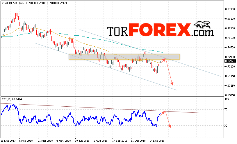 Таким образом, Форекс прогноз AUD/USD на неделю 14 — 18 января 2019 предполагает попытку теста уровня 0.7285. Далее продолжение падения ниже уровня 0.6755. В пользу снижения пары выступит тест линии тренда на индикаторе относительной силы. Отменой варианта падения станет сильный рост и пробой области 0.7365. Это укажет на пробой области сопротивления и продолжение роста пары.