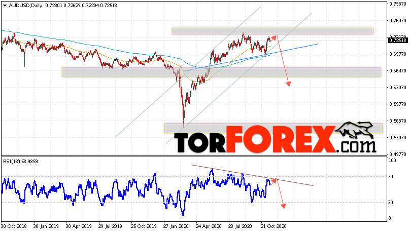 Таким образом, Форекс прогноз AUD/USD на неделю 16 — 20 ноября 2020 предполагает попытку развития коррекции и теста уровня 0.7295. Далее, продолжение падения валютной пары ниже уровня 0.6315. В пользу снижения пары на текущий торговой неделе выступит тест линии тренда на индикаторе относительной силы. Отменой варианта падения станет сильный рост и пробой области 0.7385. Это укажет на пробой области сопротивления и продолжение роста пары с целью выше 0.7695.