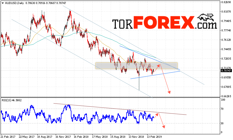 Таким образом, Форекс прогноз AUD/USD на неделю 18 — 22 марта 2019 предполагает попытку теста уровня 0.7155. Далее продолжение падения ниже уровня 0.6655. В пользу снижения пары выступит тест линии тренда на индикаторе относительной силы. Отменой варианта падения станет сильный рост и пробой области 0.7305. Это укажет на пробой области сопротивления и продолжение роста пары.