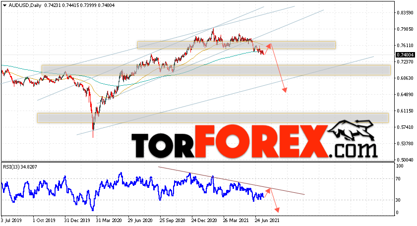 Дополнительным сигналом в пользу падения пары на Форекс выступит отскок от нижней границы бычьего канала. Вторым сигналом станет отскок от нисходящей линии тренда на индикаторе относительной силы. Отменой варианта падения валютной пары AUD/USD на текущей торговой неделе 19 — 23 июля 2021 станет сильный рост и пробой уровня 0.8015. Это укажет на пробой сопротивления и продолжение подъёма Австралийского Доллара на Форекс с потенциальной целью на уровне 0.8455. Подтверждением развития снижения выступит пробой области поддержки и закрытие цен ниже уровня 0.7235.
