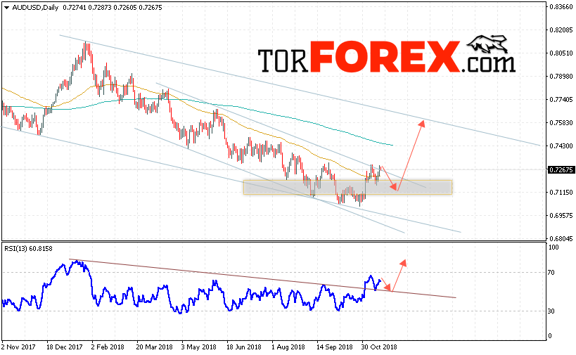 В пользу роста пары на Форекс выступит тест восходящей линии тренда на индикаторе относительной силы. Отменой варианта роста AUD/USD на текущей торговой неделе 19 — 23 ноября 2018 станет падение и пробой уровня 0.6950. Это укажет на пробой области поддержки и продолжение падения Австралийского Доллара на Форекс. Подтверждением развития восходящей тенденции выступит пробой области сопротивления и закрытие выше уровня 0.7340.