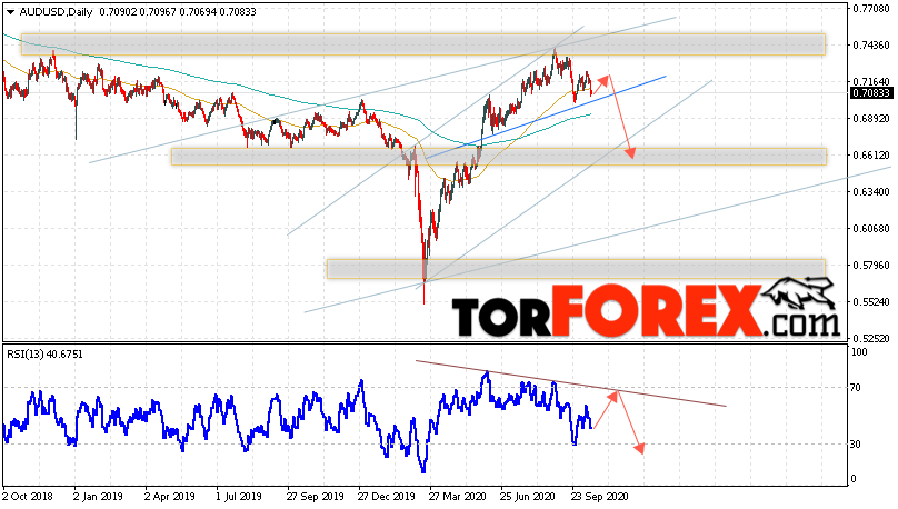 В пользу снижения пары на Форекс выступит отскок от нижней границы восходящего канала. Вторым сигналом станет отскок от линии сопротивления на индикаторе относительной силы. Отменой варианта падения валютной пары AUD/USD на текущей торговой неделе неделю 19 — 23 октября 2020 станет сильный рост и пробой уровня 0.7545. Это укажет на пробой сопротивления и продолжение роста Австралийского Доллара на Форекс с потенциальной целью на уровне 0.7965. Подтверждением развития падения выступит пробой области поддержки и закрытие ниже уровня 0.6895.