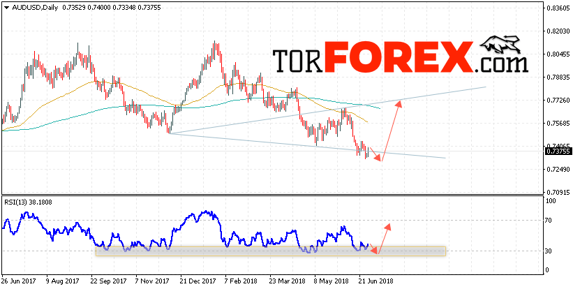 Таким образом, Форекс прогноз AUD/USD на неделю 2 — 6 июля 2018 предполагает попытку теста уровня 0.7330 и начала роста выше уровня 0.7650, в пользу восходящей коррекции по паре выступит тест области поддержки на индикаторе относительной силы, отменой варианта роста станет падение и пробой области 0.7200, что укажет на пробой нижней границы модели «Волна Вульфа» и продолжение падения пары.