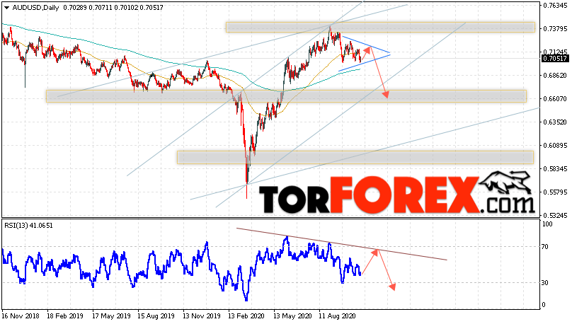 В пользу снижения пары на Форекс выступит отскок от верхней границы модели ”Треугольник”. Вторым сигналом станет отскок от линии сопротивления на индикаторе относительной силы. Отменой варианта падения валютной пары AUD/USD на текущей торговой неделе неделю 2 — 6 ноября 2020 станет сильный рост и пробой уровня 0.7365. Это укажет на пробой сопротивления и продолжение роста Австралийского Доллара на Форекс с потенциальной целью на уровне 0.7805. Подтверждением развития падения выступит пробой области поддержки и закрытие ниже уровня 0.6855.