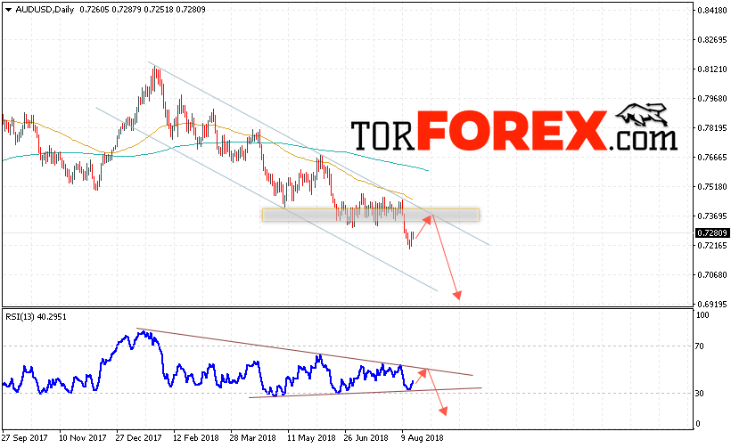 Таким образом, Форекс прогноз AUD/USD на неделю 20 — 24 августа 2018 предполагает попытку теста уровня 0.7375 и продолжения падения ниже уровня 0.6950, в пользу падения пары выступит тест линии сопротивления на индикаторе относительной силы, отменой варианта снижения станет сильный рост и пробой области 0.7470, что укажет на пробой верхней границы канала и продолжение роста пары.