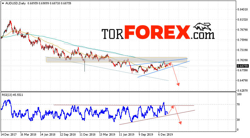 В пользу падения пары на Форекс выступит тест линии сопротивления на индикаторе относительной силы. Вторым сигналом станет отскок отскок от верхней границы модели «Клин». Отменой варианта снижения AUD/USD на текущей торговой неделе 20 — 24 января 2020 станет сильный рост и пробой уровня 0.7125. Это укажет на пробой верхней границы канала и продолжение роста Австралийского Доллара на Форекс. Подтверждением развития нисходящей тенденции выступит пробой области поддержки и закрытие ниже уровня 0.6705. Это укажет на ускорение падения валютной пары и начало отработки модели «Клин».
