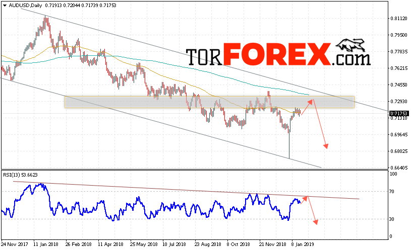 Таким образом, Форекс прогноз AUD/USD на неделю 21 — 25 января 2019 предполагает попытку теста уровня 0.7295. Далее продолжение падения ниже уровня 0.6805. В пользу снижения пары выступит тест линии тренда на индикаторе относительной силы. Отменой варианта падения станет сильный рост и пробой области 0.7435. Это укажет на пробой области сопротивления и продолжение роста пары.