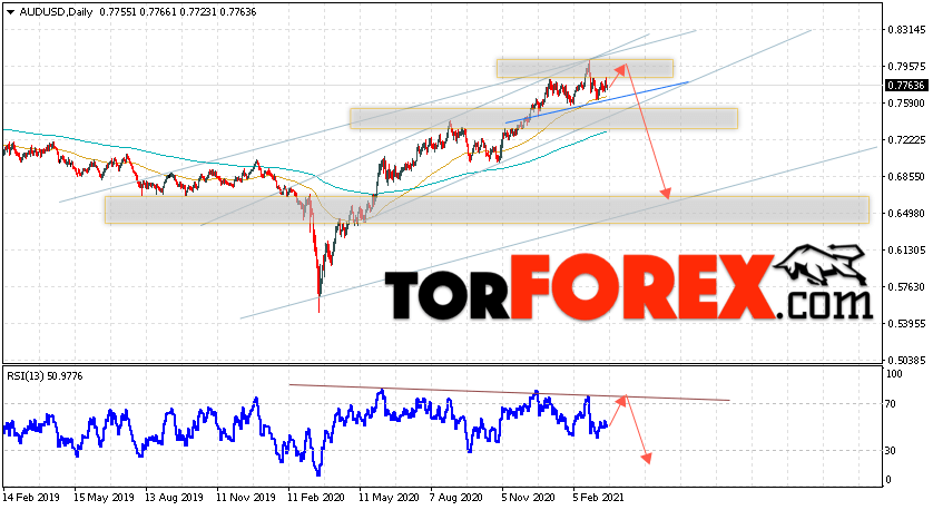 Дополнительным сигналом в пользу падения пары на Форекс выступит отскок от нижней границы восходящего канала, который был пробит вверх. Вторым сигналом станет отскок от линии сопротивления на индикаторе относительной силы. Отменой варианта падения валютной пары AUD/USD на текущей торговой неделе 22 — 26 марта 2021 станет сильный рост и пробой уровня 0.8185. Это укажет на пробой сопротивления и продолжение подъёма Австралийского Доллара на Форекс с потенциальной целью на уровне 0.8605. Подтверждением развития снижения выступит пробой области поддержки и закрытие цен ниже уровня 0.7425, что укажет на завершение формирования разворотной модели ”Голова и плечи”.