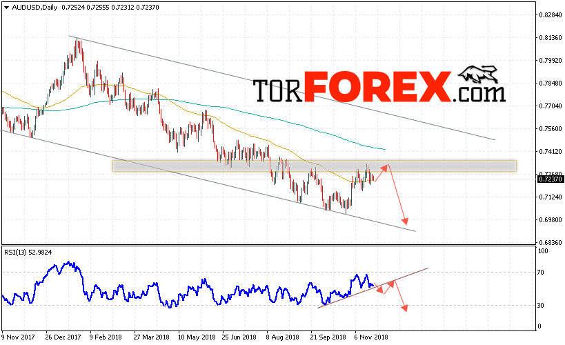 Таким образом, Форекс прогноз AUD/USD на неделю 26 — 30 ноября 2018 предполагает попытку теста уровня 0.7275. Далее продолжение падения ниже уровня 0.6980. В пользу снижения пары выступит тест линии тренда на индикаторе относительной силы. Отменой варианта падения станет сильный рост и пробой области 0.7480. Это укажет на пробой области сопротивления и продолжение роста пары.