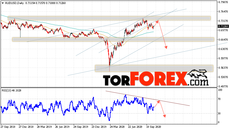 В пользу снижения пары на Форекс выступит отскок от нижней границы восходящего канала. Вторым сигналом станет отскок от линии сопротивления на индикаторе относительной силы. Отменой варианта падения валютной пары AUD/USD на текущей торговой неделе неделю 26 — 30 октября 2020 станет сильный рост и пробой уровня 0.7565. Это укажет на пробой сопротивления и продолжение роста Австралийского Доллара на Форекс с потенциальной целью на уровне 0.7985. Подтверждением развития падения выступит пробой области поддержки и закрытие ниже уровня 0.6925.