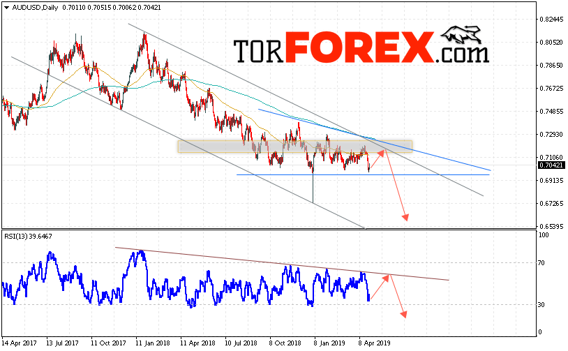 Таким образом, Форекс прогноз AUD/USD на неделю 29 апреля — 3 мая 2019 предполагает попытку теста уровня 0.7125. Далее продолжение падения ниже уровня 0.6575. В пользу снижения пары выступит тест линии тренда на индикаторе относительной силы. Отменой варианта падения станет сильный рост и пробой области 0.7345. Это укажет на пробой области сопротивления и продолжение роста пары.