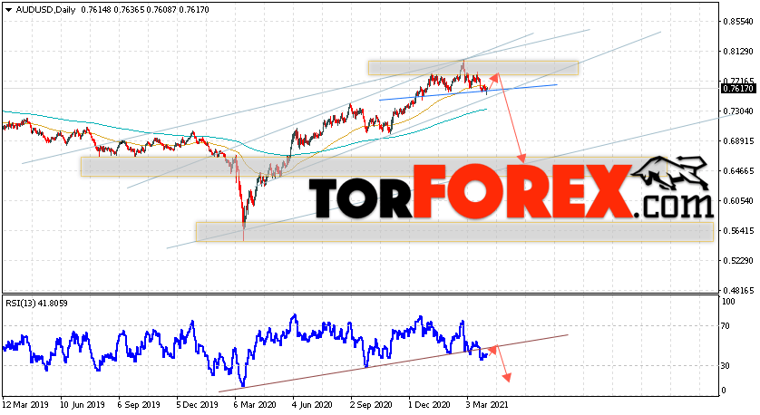 Таким образом, Форекс прогноз AUD/USD на неделю 5 — 9 апреля 2021 предполагает попытку развития бычьей коррекции и теста уровня 0.7735. Далее, продолжение снижения валютной пары ниже уровня 0.6475. В пользу падения пары на текущий торговой неделе выступит тест линии тренда на индикаторе относительной силы. Отменой варианта снижения станет сильный рост и пробой области 0.8195. Это укажет на пробой области сопротивления и продолжение роста пары с целью выше 0.8645.