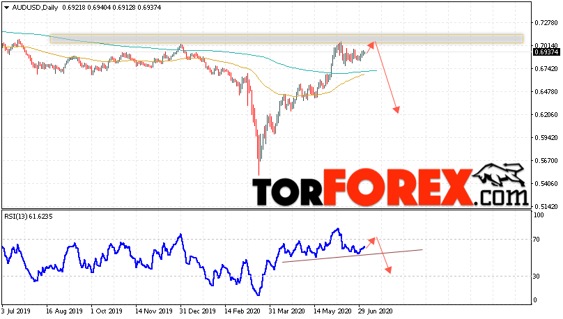В пользу снижения пары на Форекс выступает формирования разворотной модели «Голова и плечи» на индикаторе относительной силы. Вторым сигналом станет отскок от уровня сопротивления. Отменой варианта падения валютной пары AUD/USD на текущей торговой неделе 6 — 10 июля 2020 станет сильный рост и пробой уровня 0.7275. Это укажет на пробой сопротивления и продолжение роста Австралийского Доллара на Форекс с потенциальной целью на уровне 0.7655. Подтверждением развития падения выступит пробой области поддержки и закрытие ниже уровня 0.6725, что укажет на завершение формования разворотной модели «Двойная вершина».