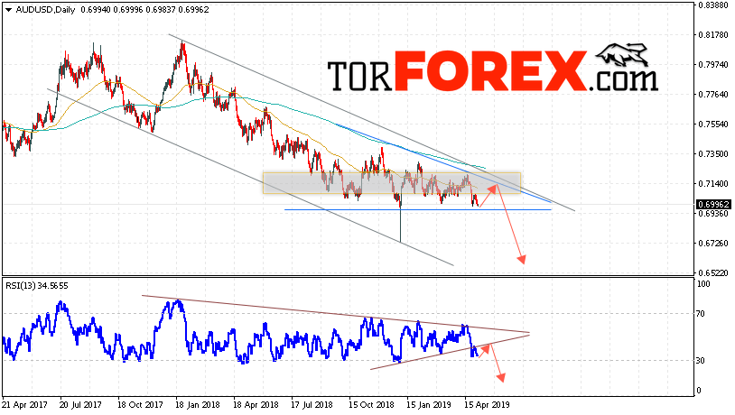 Таким образом, Форекс прогноз AUD/USD на неделю 6 — 10 мая 2019 предполагает попытку теста уровня 0.7135. Далее продолжение падения ниже уровня 0.6535. В пользу снижения пары выступит тест линии тренда на индикаторе относительной силы. Отменой варианта падения станет сильный рост и пробой области 0.7325. Это укажет на пробой области сопротивления и продолжение роста пары.