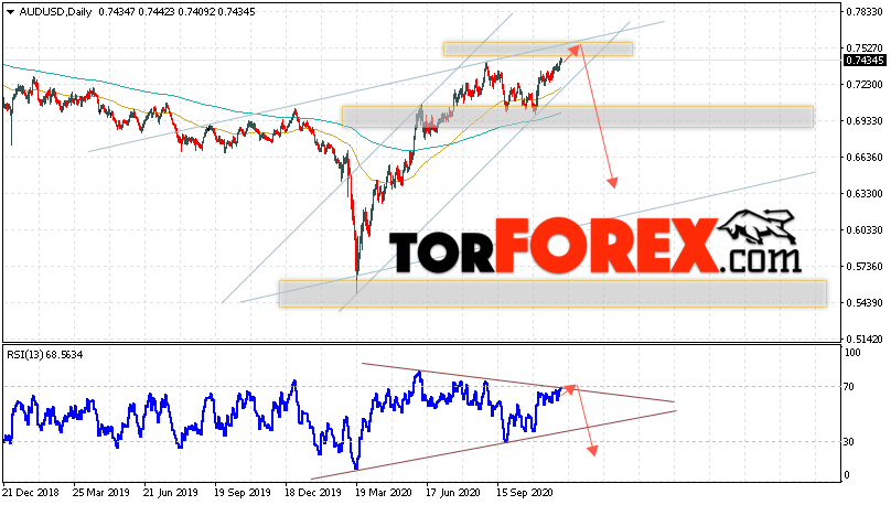 В пользу снижения пары на Форекс выступит отскок от верхней границы модели ”Двойная вершина”. Вторым сигналом станет отскок от линии сопротивления на индикаторе относительной силы. Отменой варианта падения валютной пары AUD/USD на текущей торговой неделе неделю 7 — 11 декабря 2020 станет сильный рост и пробой уровня 0.7655. Это укажет на пробой сопротивления и продолжение роста Австралийского Доллара на Форекс с потенциальной целью на уровне 0.7915. Подтверждением развития падения выступит пробой области поддержки и закрытие ниже уровня 0.6970.