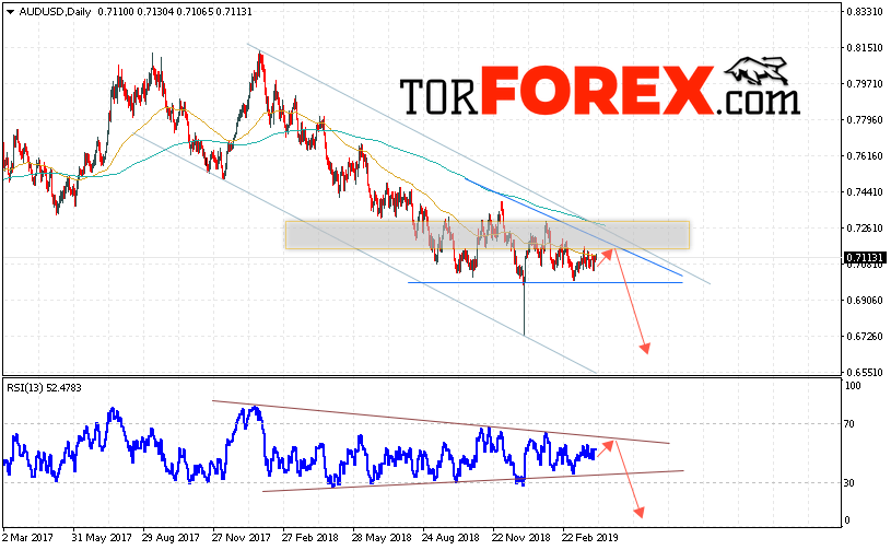 Таким образом, Форекс прогноз AUD/USD на неделю 8 — 12 апреля 2019 предполагает попытку теста уровня 0.7165. Далее продолжение падения ниже уровня 0.6585. В пользу снижения пары выступит тест линии тренда на индикаторе относительной силы. Отменой варианта падения станет сильный рост и пробой области 0.7305. Это укажет на пробой области сопротивления и продолжение роста пары.