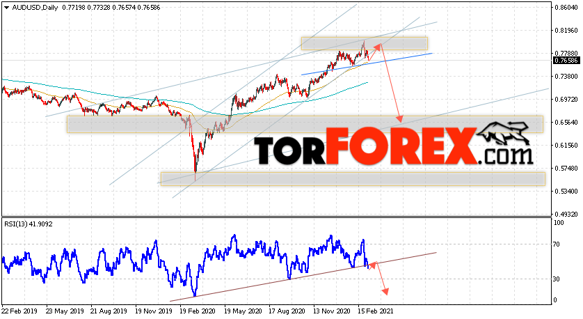 Дополнительным сигналом в пользу падения пары на Форекс выступит отскок от нижней границы восходящего канала. Вторым сигналом станет отскок от линии сопротивления на индикаторе относительной силы. Отменой варианта падения валютной пары AUD/USD на текущей торговой неделе 8 — 12 марта 2021 станет сильный рост и пробой уровня 0.8195. Это укажет на пробой сопротивления и продолжение подъёма Австралийского Доллара на Форекс с потенциальной целью на уровне 0.8625. Подтверждением развития снижения выступит пробой области поддержки и закрытие цен ниже уровня 0.7365.