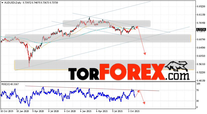 Дополнительным сигналом в пользу падения пары на Форекс выступит отскок от верхней границы нисходящего канала. Вторым сигналом станет отскок от медвежьей линии тренда на индикаторе относительной силы. Отменой варианта падения валютной пары AUD/USD на текущей торговой неделе 8 — 12 ноября 2021 станет сильный рост и пробой уровня 0.7865. Это укажет на пробой сопротивления и продолжение подъёма Австралийского Доллара на Форекс с потенциальной целью на уровне 0.8425. Подтверждением развития снижения выступит пробой области поддержки и закрытие цен ниже уровня 0.7005.