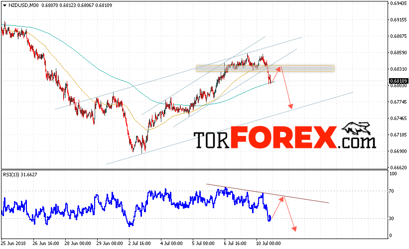Таким образом, Форекс прогноз и аналитика NZD/USD на 11 июля 2018 предполагает попытку теста области сопротивления вблизи уровня 0.6830, откуда стоит ожидать продолжения снижения котировок в область ниже уровня 0.6760, дополнительным сигналом в пользу падения выступит тест линии тренда на индикаторе относительной силы, отменой варианта снижения пары NZD/USD станет сильный рост и пробой уровня 0.6865, в этом случае стоит ожидать продолжения роста пары.