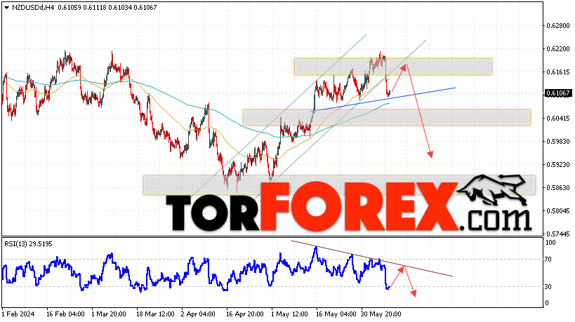 Таким образом, Форекс прогноз и аналитика NZD/USD на 11 июня 2024 предполагает попытку теста области сопротивления вблизи уровня 0.6165. Откуда стоит ожидать продолжения вниз котировок в область ниже уровня 0.5925. Дополнительным сигналом в пользу падения выступит тест линии тренда на индикаторе относительной силы. Отменой варианта снижения пары NZD/USD станет сильный рост цены и пробой уровня 0.6245. В этом случае стоит ожидать продолжение подъёма пары с потенциальной целью выше уровня 0.6465.