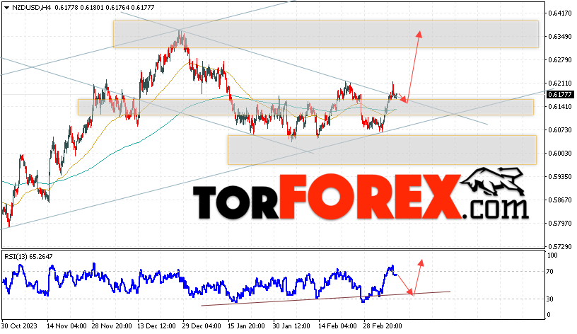 Таким образом, Форекс прогноз и аналитика NZD/USD на 12 марта 2024 предполагает попытку теста области поддержки вблизи уровня 0.6155. Откуда стоит ожидать продолжения роста котировок в область выше уровня 0.6345. Дополнительным сигналом в пользу подъёма выступит тест линии тренда на индикаторе относительной силы. Отменой варианта роста пары NZD/USD станет падение цены и пробой уровня 0.6025. В этом случае стоит ожидать продолжение снижения пары с потенциальной целью ниже уровня 0.5805.