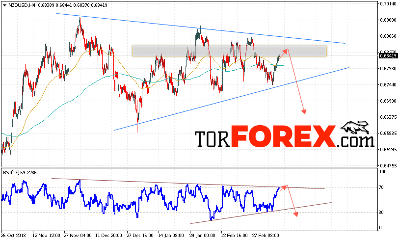 В пользу падения пары NZD/USD выступит отскок от нисходящей линии тренда на индикаторе относительной силы. Вторым сигналом выступит отскок от нижней границы модели «Треугольник». Отменой варианта падения котировок Новозеландского Доллара на Форекс станет сильный рост и пробой уровня 0.6925. Это укажет на пробой уровня сопротивления. В таком случае пара продолжит рост в область выше уровня 0.7075. Ожидать ускорения снижения пары стоит с пробоем области поддержки и закрытием котировок ниже уровня 0.6725.