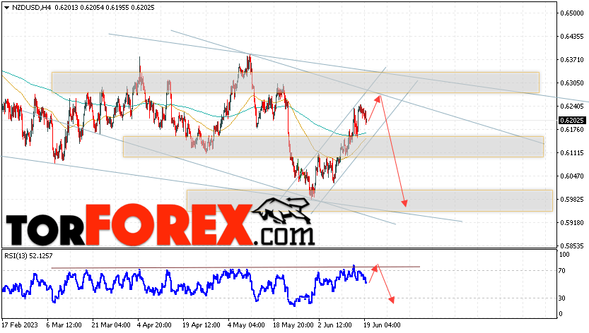 Таким образом, Форекс прогноз и аналитика NZD/USD на 20 июня 2023 предполагает попытку теста области сопротивления вблизи уровня 0.6245. Откуда стоит ожидать продолжения падения котировок в область ниже уровня 0.5975. Дополнительным сигналом в пользу снижения выступит тест линии тренда на индикаторе относительной силы. Отменой варианта падения пары NZD/USD станет сильный рост цены и пробой уровня 0.6335. В этом случае стоит ожидать продолжение подъёма пары с потенциальной целью выше уровня 0.6575.