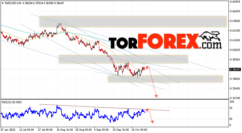 Таким образом, Форекс прогноз и аналитика NZD/USD на 20 октября 2022 предполагает попытку теста области сопротивления вблизи уровня 0.5705. Откуда стоит ожидать продолжения падения котировок в область ниже уровня 0.5185. Дополнительным сигналом в пользу снижения выступит тест линии тренда на индикаторе относительной силы. Отменой варианта падения пары NZD/USD станет сильный рост цены и пробой уровня 0.5845. В этом случае стоит ожидать продолжение подъёма пары с потенциальной целью выше уровня 0.6065.