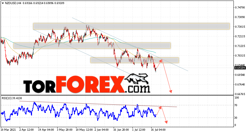 Таким образом, Форекс прогноз и аналитика NZD/USD на 21 июля 2021 предполагает попытку теста области сопротивления вблизи уровня 0.6965. Откуда стоит ожидать продолжения падения котировок в область ниже уровня 0.6675. Дополнительным сигналом в пользу снижения выступит тест линии тренда на индикаторе относительной силы. Отменой варианта падения пары NZD/USD станет сильный рост цены и пробой уровня 0.7065. В этом случае стоит ожидать продолжение подъёма пары с потенциальной целью выше уровня 0.7345.