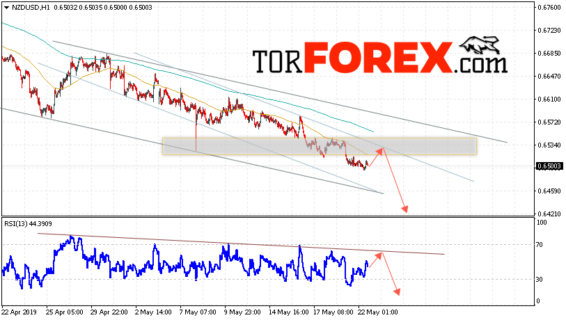 Таким образом, Форекс прогноз и аналитика NZD/USD на 23 мая 2019 предполагает попытку теста области сопротивления вблизи уровня 0.6500. Откуда стоит ожидать продолжения падения котировок в область ниже уровня 0.6415. Дополнительным сигналом в пользу падения выступит тест линии сопротивления на индикаторе относительной силы. Отменой варианта снижения пары NZD/USD станет сильный рост и пробой уровня 0.6585. В этом случае стоит ожидать продолжения подъёма пары с потенциальной целью выше 0.6700.