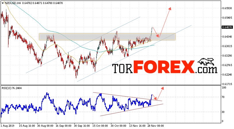 Таким образом, Форекс прогноз и аналитика NZD/USD на 3 декабря 2019 предполагает попытку теста области поддержки вблизи уровня 0.6435. Откуда стоит ожидать продолжения роста котировок в область выше уровня 0.6605. Дополнительным сигналом в пользу подъёма выступит тест линии поддержки на индикаторе относительной силы. Отменой варианта роста пары NZD/USD станет падение и пробой уровня 0.6375. В этом случае стоит ожидать снижения подъёма пары с потенциальной целью ниже уровня 0.6195.