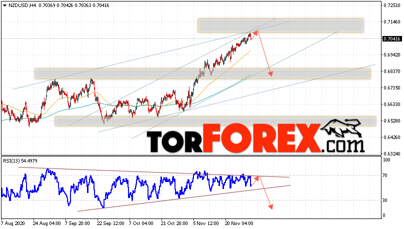Дополнительным сигналом в пользу снижения валютной пары NZD/USD на Форекс выступит тест нисходящей линии тренда на индикаторе относительной силы. Вторым сигналом в пользу падения станет отскок от верхней границы восходящего канала. Отменой варианта падения котировок Новозеландского Доллара на Форекс станет сильный рост и пробой уровня 0.7145. Это укажет на пробой области сопротивления. В таком случае пара продолжит развитие подъёма в область выше уровня 0.7465. Ожидать подтверждения падения валютной пары NZD/USD стоит с пробоем области поддержки и закрытием котировок ниже уровня 0.6945.