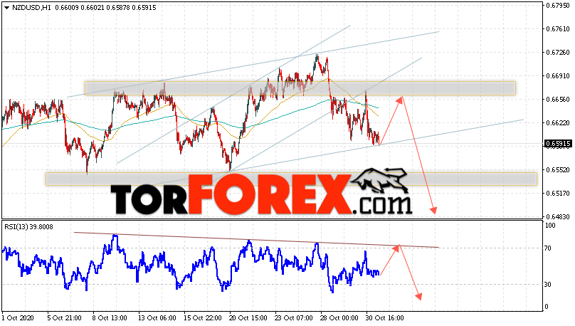 Таким образом, Форекс прогноз и аналитика NZD/USD на 3 ноября 2020 предполагает попытку теста области сопротивления вблизи уровня 0.6655. Откуда стоит ожидать продолжения падения котировок в область ниже уровня 0.6475. Дополнительным сигналом в пользу снижения выступит тест линии тренда на индикаторе относительной силы. Отменой варианта падения пары NZD/USD станет сильный рост цен и пробой уровня 0.6765. В этом случае стоит ожидать продолжение подъёма пары с потенциальной целью выше уровня 0.6975.
