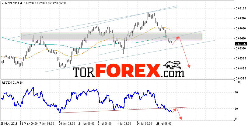 Таким образом, Форекс прогноз и аналитика NZD/USD на 30 июля 2019 предполагает попытку теста области сопротивления вблизи уровня 0.6650. Откуда стоит ожидать продолжения падения котировок в область ниже уровня 0.6485. Дополнительным сигналом в пользу снижения выступит тест линии сопротивления на индикаторе относительной силы. Отменой варианта падения пары NZD/USD станет сильный рост и пробой уровня 0.6705. В этом случае стоит ожидать продолжения подъёма пары с потенциальной целью выше уровня 0.6815.