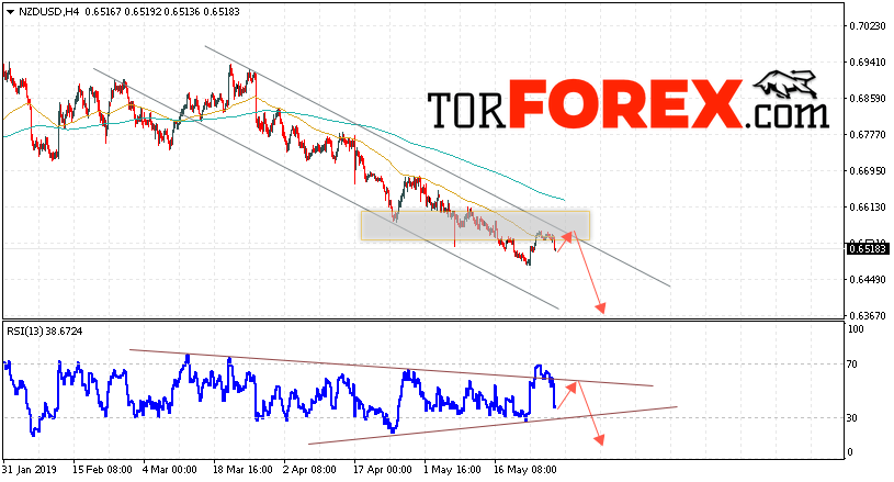 В пользу падения пары NZD/USD выступит отскок от нисходящей линии тренда на индикаторе относительной силы (RSI). Вторым сигналом выступит отскок от верхней границы нисходящего канала. Отменой варианта падения котировок Новозеландского Доллара на Форекс станет сильный рост и пробой уровня 0.6625. Это укажет на пробой верхней границы нисходящего канала. В таком случае пара продолжит рост в область выше уровня 0.6745. Ожидать подтверждения снижения пары стоит с пробоем области поддержки и закрытием котировок ниже уровня 0.6495.
