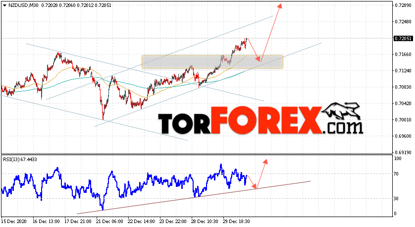 Таким образом, Форекс прогноз и аналитика NZD/USD на 31 декабря 2020 предполагает попытку теста области поддержки вблизи уровня 0.7145. Откуда стоит ожидать продолжения роста котировок в область выше уровня 0.7285. Дополнительным сигналом в пользу подъёма выступит тест линии тренда на индикаторе относительной силы. Отменой варианта роста пары NZD/USD станет падение цен и пробой уровня 0.7075. В этом случае стоит ожидать продолжение снижения пары с потенциальной целью ниже уровня 0.7005.