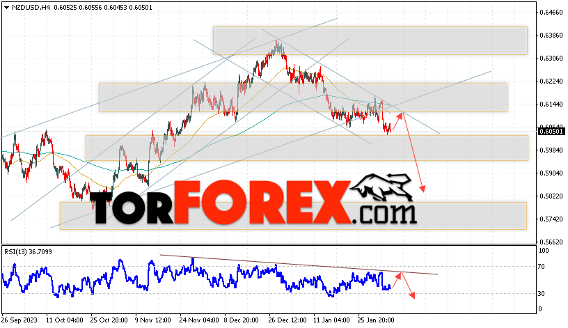 Дополнительным сигналом в пользу падения валютной пары NZD/USD на Форекс выступит тест линии сопротивления на индикаторе относительной силы. Вторым сигналом в пользу данного сценария станет отбой от верхней границы медвежьего канала. Отменой варианта падения котировок Новозеландского Доллара на Форекс станет сильный рост цены и пробой уровня 0.6225. Это укажет на пробой области сопротивления. В таком случае пара продолжит развитие подъёма в область выше уровня 0.6415. Ожидать подтверждения падению валютной пары NZD/USD стоит с пробоем области поддержки и закрытием котировок ниже уровня 0.6005.